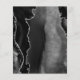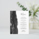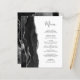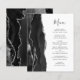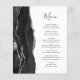 The left-hand edge of this elegant modern wedding menu features a black watercolor agate border trimmed with faux silver glitter. The customizable text combines charcoal gray handwriting script and copperplate fonts on a white background. The reverse side features a matching black and silver agate design.