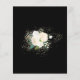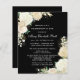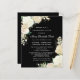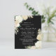An elegant arrangement of white roses is nestled in dark green and gold leaves. White text pops on a black background. The deceased person's name is written in a traditional script text. All of the text can be easily edited to create a personal remembrance.