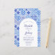This rustic design features a background pattern of blue and white watercolor Portuguese tiles, or azulejos. Personalise it with the names of the bride and groom in blue calligraphy script and the remaining text in a combination of sans serif, copperplate and italics on a white arch shape. A matching tile pattern appears on the reverse side.