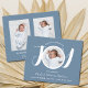 Introduce your beautiful newborn baby boy with this budget birth announcement. The front features the word joy in stylish white script typography on a blue background and your newborn's photo, full name, arrival date, and birth stats. On the back of the card, you can add two additional photos.