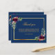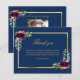 A simple and elegant sympathy thank you card with photo. A navy blue background, a faux gold frame and burgundy florals. Personalise and add your thank you note.