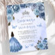 This lovely quinceañera invitation features a border of blue roses with silver faux glitter foliage on a blue watercolor background. A silver tiara, a dark-haired girl in a blue princess dress and small blue butterflies decorate the text. The word "Quinceañera" and the name of the guest of honour appear in elegant blue handwriting script, with the remaining text in grey sans serif font.