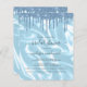 A chic, modern design featuring a pale blue silk or satin background with a top border of blue glitter drips. The words "bridal shower" and the name of the bride-to-be appear in lowercase calligraphy script with decorative swashes at the beginning and end, with the remaining text in sans serif font. The blue satin background and glitter drip border are repeated on the reverse. (To keep the swashes, replace only the letters of the bride-to-be's name, leaving the symbols in place.)