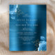 This glamourous floral wedding invitation features light blue and teal floral bouquets set off with gold faux foil foliage in two corners. The names of the couple appear in classic white serif font, with the remaining text in italics, on a teal blue faux brushed metal background.