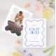 This wedding save the date card is feature a wavy border. It uses calm colours like lavender inspired by lavender fields. The fun and stylish fonts add a touch of elegance, and word at the centre are highlighted in bright blue for a fun pop of colour and uses a bigger font size.