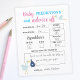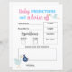 Budget baby predictions and advice for the parents paper sheet your guests can fill at the gender reveal party. Cute quiz your guests can play. Design in blue and pink with cute illustrations of stork birds delivering a baby girl and a baby boy. Personalise it or change the font, colours, and wording by clicking the button to edit the design.