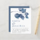 Modern Blue Watercolor Foliage Wedding. A budget price SMALLER 4.5” x 5.6” alternative. Available in a SEMI-GLOSS 110 lb CARD STOCK which is the default option (thicker for invitations), OR a SATIN FINISH 80 lb THINNER PAPER STOCK (ideal for enclosures). Envelopes are an optional extra and are slightly larger than the card size. Informal style. Modern large watercolor deep blue leaves decorate the top and your names are large below in stylish lowercase with the details at the bottom. Easily personalise the text to your own details.