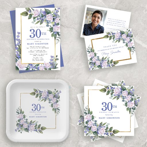 30th Birthday White Blue Gold FloralDesigned by Nelda Hoxie
