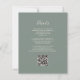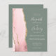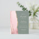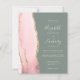 The left-hand edge of this elegant modern wedding invitation features a blush pink watercolor agate border trimmed with faux gold glitter. The customisable text combines pale blush handwriting, copperplate and italic fonts on a deep sage green background. The reverse side provides space for wedding details on a solid sage green background, along with a QR code guests can scan to visit your website and RSVP, which saves the cost of printing and mailing separate RSVP
