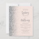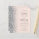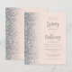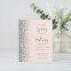 The left-hand edge of this elegant modern wedding invitation features a silver faux glitter border. The customisable text combines grey calligraphy script and sans serif font on a blush pink background. The reverse side features a matching blush and silver design.