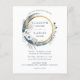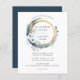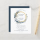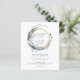 This boho wedding design features the couple's names framed by a watercolor wreath that includes a sliver of indigo blue moon, pampas grass, white flowers, and a gold faux foil circle. Personalise the blue text with the wedding details. The reverse side is solid blue.