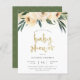 This bohemian invitation features "baby shower" in a brushed faux gold script, framed by confetti, three blush pink flowers, and watercolor foliage. Your details appear underneath in an elegant typography. The cards reverse to a beautiful shade of green with a simple white pattern. This design is great for outdoor events or floral-themed showers. As part of the budget selection here on Zazzle, these invitations do not come with envelopes nor do they fit perfectly in a standard-sized envelope. The closest size is A6 but there would be a gap of approximately half an inch. If you don't mind this, you can use such widely available A6 envelopes. Otherwise, this design can be transferred to a standard 5x7 format (which comes with envelopes) using the design transfer tool.