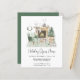 Budget boho-inspired holiday open house invitation featuring a watercolor illustration of a cosy sage green home interior and fireplace decorated for Christmas with a wreath, reindeer, a Christmas tree, candles and gnomes.