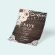 Budget Boho chic wedding save the date flyer features neutral flowers with pampa grass and string lights on wood.