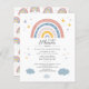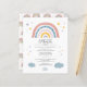 Create your cute baby invitations with this pretty and adorable rainbow boho watercolor invitation design in tan, yellow, and blue, featuring stars and clouds. The reverse side features a watercolor rainbow pattern on white background.