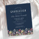 A beautiful watercolor floral border of wildflowers decorates the bottom edge of this trendy boho graduation party invitation. Customise the white text on a navy blue background with the graduate's name in handwriting script; the school and class year in sans serif; and the date, venue, and RSVP details in serif font. The back of the card is solid navy blue.