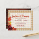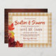 Fun bonfire and s'more party invitation in a plaid and wood design with fall autumnal leaves.
