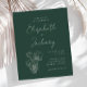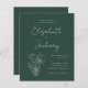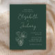 This modern wedding invitation features cream-coloured text on a dark green background. A line art floral design appears in the lower left corner. Add the names of the bride and groom in stylish cream handwriting script and the details in sans serif font.
