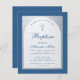 A baptism invitation recommended for a boy. On a classic blue rectangular background, it has a faux silver foil arch that has inside blue text on white background. The word Baptism and the name are written in an elegant calligraphic script; the first line is arched text.