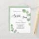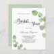 A white background decorated with eucalyptus greenery sprigs. Personalise and the name of the bride to be and party details.