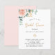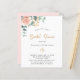A chic white background. Decorated with a rose gold and blush pink floral, rose flower and green watercolored eucalyptus leaves, sprigs, greenery and a faux gold sprig. Personalise and add the name of the bride to be and party details. Black and golden coloured letters.