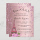A modern, stylish and glamourous invitation for a bridal shower, parisian theme. A blush pink metallic looking background with pink heart sprinkles and the Eiffel tower with some flowers. The name is written with a modern hand lettered style script. Personalise and add a name and party details.