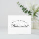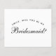 A simple, minimalist bridesmaid proposal: just black text on white background. The word Bridesmaid on the front and the message on the back are written in an elegant calligraphic script, the arched text "[Name] will you be my" above the word Bridesmaid in small caps.