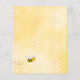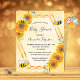 Elegant, fun baby shower invitation, gender neutral. Yellow background with a golden honeycomb pattern. With a faux gold geometric frame. Decorated yellow, orange sunflowers and happy bumble bees. With the text: Baby Shower and the name om the mommy to bee on front written with a modern hand lettered style script. Black letters.