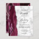 The left-hand edge of this elegant modern wedding invitation features a burgundy watercolor agate border trimmed with silver faux glitter. The customisable text combines handwriting, copperplate and italic fonts in black on a grey and white marble background. The reverse side features a matching burgundy and silver agate design.
