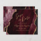 This elegant wedding save the date card features a background image of burgundy red watercolor agate trimmed with faux gold glitter. The customisable text combines gold-coloured modern handwriting, copperplate and italic fonts. The reverse side features a coordinating burgundy and gold agate design.