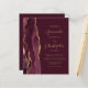 The left-hand edge of this elegant modern wedding invitation features a burgundy red watercolor agate border trimmed with faux gold glitter. The customisable text combines gold-coloured script and sans serif fonts on a burgundy background. The reverse side provides space for wedding details on a solid burgundy background, along with a QR code guests can scan to visit your website and RSVP, which saves the cost of printing and mailing separate RSVP cards.