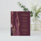 The left-hand edge of this elegant modern wedding menu features a burgundy watercolor agate design trimmed with faux gold glitter. The customisable text combines gold-coloured handwriting script and sans serif fonts on a burgundy red background. The burgundy and gold agate design is repeated on the reverse side.