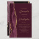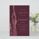 The left-hand edge of this elegant modern wedding invitation features a burgundy red watercolor agate border trimmed with faux gold glitter. The customisable text combines gold-coloured script and sans serif fonts on a burgundy background. A matching burgundy agate design appears on the back of the card.