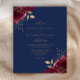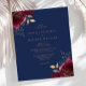 This romantic floral wedding invitation features burgundy floral bouquets set off with gold faux foil foliage in two corners. The names of the couple appear in classic gold-coloured serif font, with the remaining text in italics, on a navy blue background. The back of the card is solid navy blue.