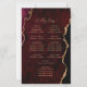 This elegant, modern wedding program features a burgundy red agate background trimmed with gold faux glitter. The text appears in gold-colored handwriting and copperplate fonts.