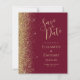 The left-hand edge of this elegant modern wedding save the date card features a gold faux glitter border. The customisable text combines pale gold-coloured handwriting, copperplate and italic fonts on a burgundy red background. The reverse side features a matching burgundy and gold design.