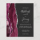 The left-hand edge of this elegant modern wedding invitation features a burgundy watercolor agate border trimmed with silver faux glitter. The customisable text combines silver grey handwriting, copperplate and italic fonts on an off-black background. The reverse side features a matching burgundy and silver agate design.