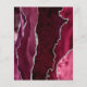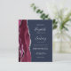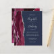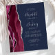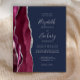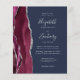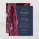 The left-hand edge of this elegant modern wedding invitation features a burgundy watercolor agate border trimmed with silver faux glitter. The customisable text combines silver grey handwriting, copperplate and italic fonts on a navy blue background. The reverse side features a matching burgundy and silver agate design.