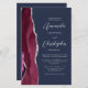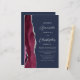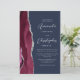 The left-hand edge of this elegant modern wedding invitation features a burgundy red watercolor agate border trimmed with faux silver glitter. The customisable text combines silver grey script and sans serif fonts on a navy blue background. The reverse side provides space for wedding details on a solid navy blue background, along with a QR code guests can scan to visit your website and RSVP, which saves the cost of printing and mailing separate RSVP cards.