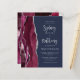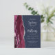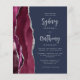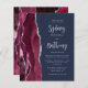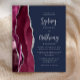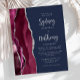The left-hand edge of this elegant modern wedding invitation features a burgundy watercolor agate border trimmed with silver faux glitter. The customisable text combines silver grey calligraphy script and sans serif font on a navy blue background. The reverse side features a matching burgundy and silver agate design.