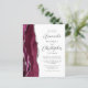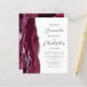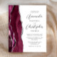 The left-hand edge of this elegant modern wedding invitation features a burgundy red watercolor agate border trimmed with faux silver glitter. The customisable text combines charcoal grey script and sans serif fonts on a white background. The reverse side features a matching burgundy and silver agate design.