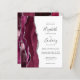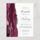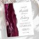 The left-hand edge of this elegant modern wedding invitation features a burgundy watercolor agate border trimmed with silver faux glitter. The customisable text combines charcoal grey handwriting, copperplate and italic fonts on a white background. The reverse side features a matching burgundy and silver agate design.