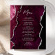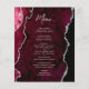 This elegant modern wedding menu features a burgundy red watercolor agate background trimmed with faux silver glitter. The customizable text combines silver gray handwriting script and copperplate fonts. The reverse side features a matching burgundy and silver agate design.