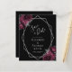 This elegant modern wedding save the date card features a silver geometric frame decorated with burgundy and silver floral bouquets on a black background. The customisable text combines silver grey whimsical handwriting, copperplate and italic fonts. The reverse side is solid black.