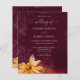 A bright yellow sunflower is nestled in modern botanical line drawings to create a modern and elegant floral border along the left side of this burgundy wedding invitation. Gold confetti is sprinkled across the red burgundy background to create a rustic glam vibe.