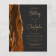 The left-hand edge of this elegant modern wedding invitation features a burnt orange watercolor agate border trimmed with faux gold glitter. The customisable text combines gold-coloured script, copperplate and italic fonts on a dark off-black background. The reverse side features a matching burnt orange and gold agate design.