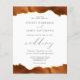 This elegant wedding invitation features watercolor burnt orange agate trimmed with gold faux foil at the top and bottom borders. The word "wedding" appears in calligraphic script. Customise the charcoal grey text with the names of the bride and groom and the wedding details. The burnt orange and gold agate design is repeated on the reverse.