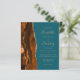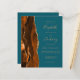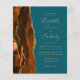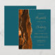 The left-hand edge of this elegant modern wedding invitation features a burnt orange watercolor agate border trimmed with faux gold glitter. The customisable text combines gold-coloured handwriting, copperplate and italic fonts on a teal blue background. The reverse side is solid teal. NOTE: Envelopes are not automatically included with these budget invitations, so please remember to choose the "white envelopes" option!