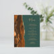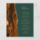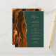 The left-hand edge of this elegant modern wedding menu features a burnt orange watercolor agate border trimmed with faux gold glitter. The customisable text combines gold-coloured handwriting script and copperplate fonts on a dark emerald green background. The reverse side features a matching burnt orange and gold agate design.