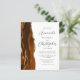 The left-hand edge of this elegant modern wedding invitation features a burnt orange watercolor agate border trimmed with faux gold glitter. The customisable text combines charcoal grey script and sans serif fonts on a white background. The reverse side features a matching burnt orange and gold agate design.